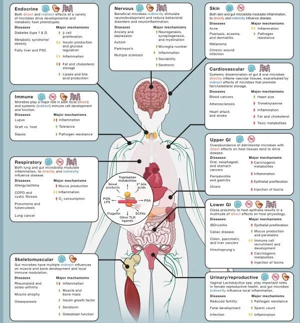 來自微生物區(qū)系的特定微生物在其表面產(chǎn)生代謝物或表達(dá)分子,這些分子可以引導(dǎo)炎癥或耐受免疫途徑。它們可以作用于這些微生物所在的局部部位,如皮膚、腸道、肺和口腔,或者對大腦、淋巴結(jié)、心臟或胰腺產(chǎn)生全身性影響。