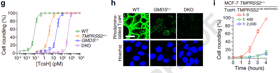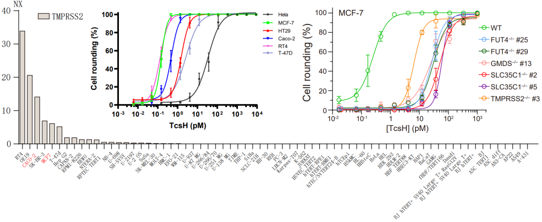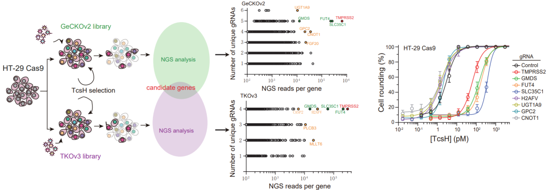 由于可參考的關(guān)于 TcsH 的先前研究相對(duì)稀少,團(tuán)隊(duì)在初期也遇到了不小的困難。其中一個(gè)難點(diǎn)就是合適的與毒素互作的靶向細(xì)胞的選擇。與其它 LCT 相比,TcsH 在很多常見細(xì)胞株上表現(xiàn)出來的毒性很弱。研究團(tuán)隊(duì)意識(shí)到篩選合適細(xì)胞系的重要性,于是測(cè)試了大量的不同組織來源的細(xì)胞系,多數(shù)人源細(xì)胞系對(duì) TcsH 都不敏感,但研究中也發(fā)現(xiàn)了兩株特定的細(xì)胞,人結(jié)腸癌細(xì)胞系 HT-29 和人結(jié)直腸癌細(xì)胞系 Caco-2,對(duì) TcsH 高度敏感?;谶@一發(fā)現(xiàn),團(tuán)隊(duì)選取了 HT-29 細(xì)胞作為研究 TcsH 的模式細(xì)胞,并且為了提高成功率,選擇兩個(gè)不同來源的人源 sgRNA 文庫在 HT-29 細(xì)胞上構(gòu)建敲除文庫。通過 TcsH 壓力篩選,研究者們發(fā)現(xiàn)這兩個(gè)獨(dú)立的篩選系統(tǒng)同時(shí)富集了一系列共同的靶向基因,包括跨膜絲氨酸蛋白酶2(TMPRSS2 )及巖藻糖基化修飾相關(guān)基因 GMDS、SLC35C1、FUT4(圖1)。通過構(gòu)建基因突變和回補(bǔ)細(xì)胞,研究者們證明這些基因?qū)?TcsH 的細(xì)胞侵入起了重要作用。