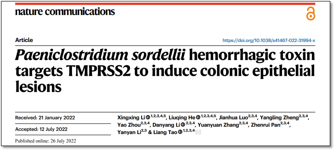 北京時(shí)間2022年7月26日,團(tuán)隊(duì)在 Nature Communications 上在線發(fā)表題為 “Paeniclostridium sordellii hemorrhagic toxin targets TMPRSS2 to induce colonic epithelial lesions” 的研究論文,首次揭示 TMPRSS2 是 TcsH 的腸上皮受體,填補(bǔ)了多年以來對(duì)出血毒素 TcsH 知之甚少的領(lǐng)域空白。